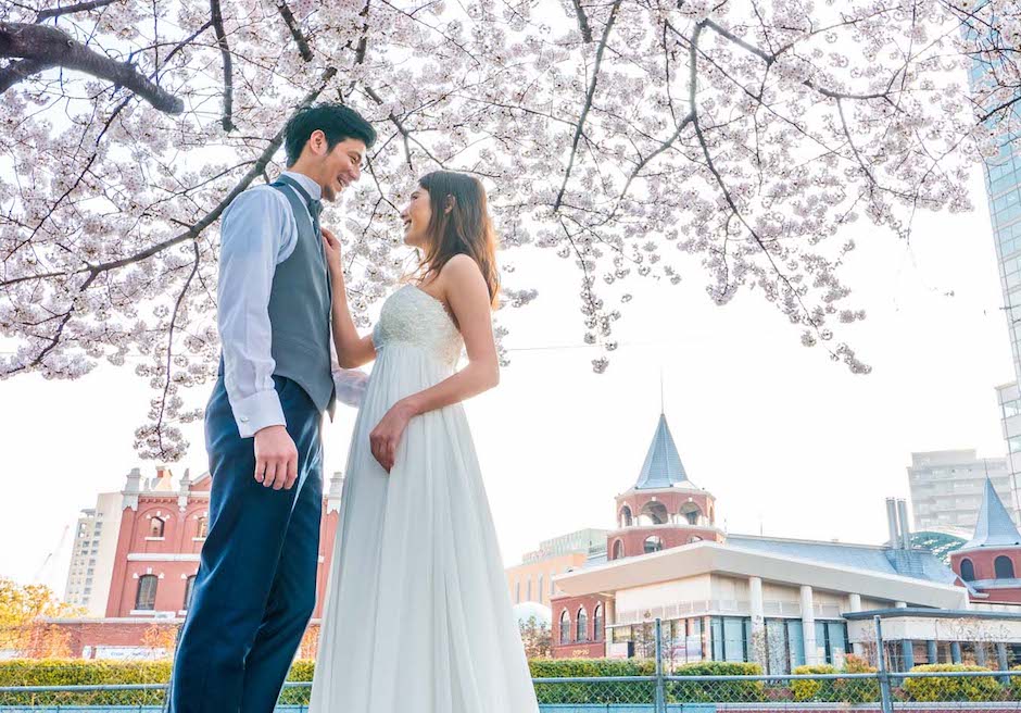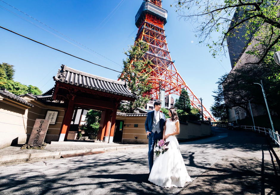 芝大門では、カジュアルなスタイルでシャボン玉をしている写真でも人気がある気軽なフォト撮影がおすすめ。ご新郎もタキシードドレスではなく、シャツと蝶ネクタイのみとか気さくで少し人とは違った撮影がしたいというカップルにはおすすめです。少し離れた場所には福山雅治の名曲『桜坂』で有名になった桜坂はこのエリア。