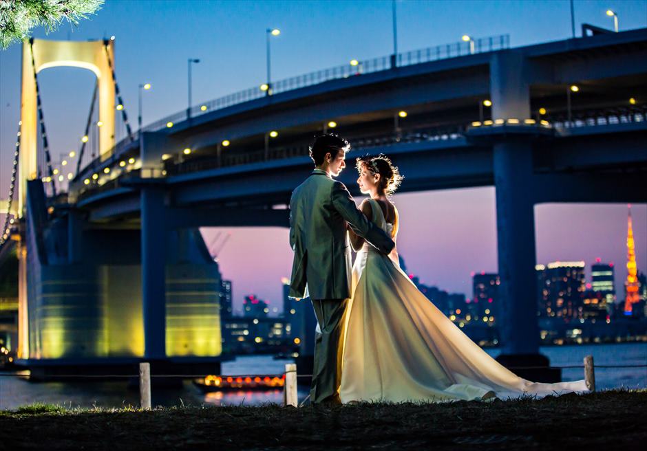そして何と言っても、フォトウェディングは夜でも素晴らしい撮影が可能です。こちらのエリアでは、お台場海浜公園エリアでのレインボーブリッジなどを撮影に移し込んだナイトフォトがおすすめ。運が良ければ東京タワーを臨め、思い出に残る一枚にきっとなるはず。